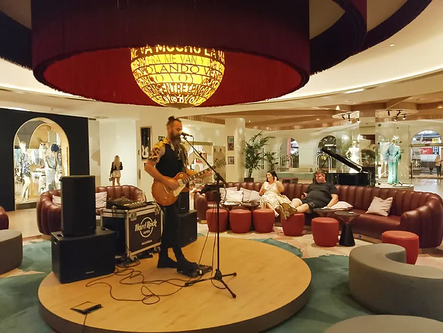 La consigna del complejo malagueño, gestionado por Palladium Hotel Group en nuestro país, es la misma que la del resto de los alojamientos de Hard Rock: música, lujo y diversión. Que esto va de ritmo se nota nada más poner un pie en él, ya que siempre hay una banda sonora detrás, ya sea a través del hilo musical que se escucha en cada estancia, de la recepción al hall al bufé del desayuno, la piscina o en los pasillos que conducen a las habitaciones.