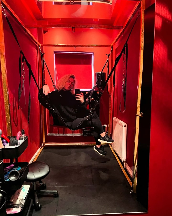 Calandra Balfour en uno de los arneses del alojamiento "Brighton Dungeon". (Foto: Instagram @calandrabalfour)