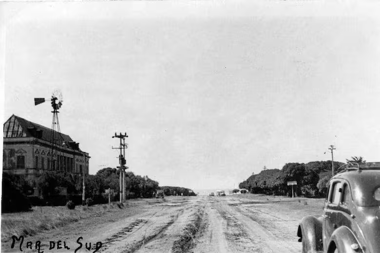 Mar del Sud y Boulevard Atlántico hacia los años 50. Sobre la izquierda puede verse su emblemático hotel. A dos kilómetros de allí fue encontrada la lápida enterrada