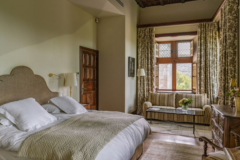 Sus 18 habitaciones y suites se distribuyen en cinco categorías, cada una con un carácter y nombre evocador como La Favorite, La Dordogne o Le Cèdre. Los espacios combinan refinados tejidos, muebles antiguos y vistas impresionantes, junto con comodidades modernas como baños amplios, Wi-Fi, aire acondicionado y detalles tecnológicos bajo petición. El château brinda acceso a todas las instalaciones de un gran hotel: piscina climatizada, pista de tenis rápida, ascensor y una capilla románica para ceremonias privadas. Especial atención recibe la hospitalidad familiar, con habitaciones comunicadas y servicios adaptados para los niños, quienes reciben kits de bienvenida exclusivos.