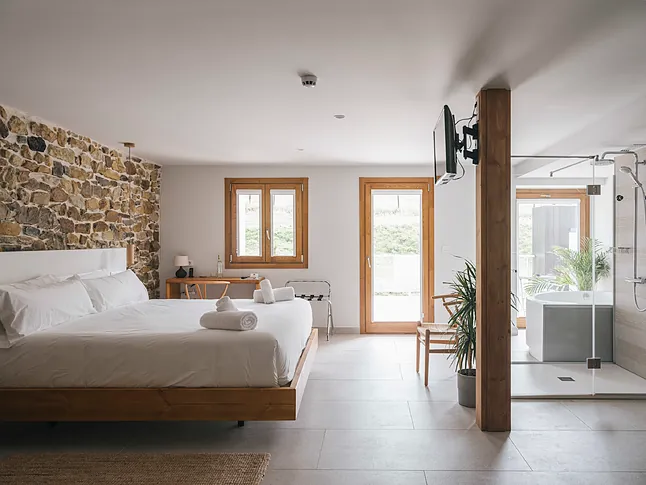 Dentro de cada dormitorio el confort de la esencia rural lo aportan la piedra vista de las paredes, las enormes vigas en lo alto, la chimenea de diseño o la bañera de hidromasaje, lista para darse un homenaje relajante. Quien prefiera practicar yoga o pilates tiene una esterilla ad hoc.