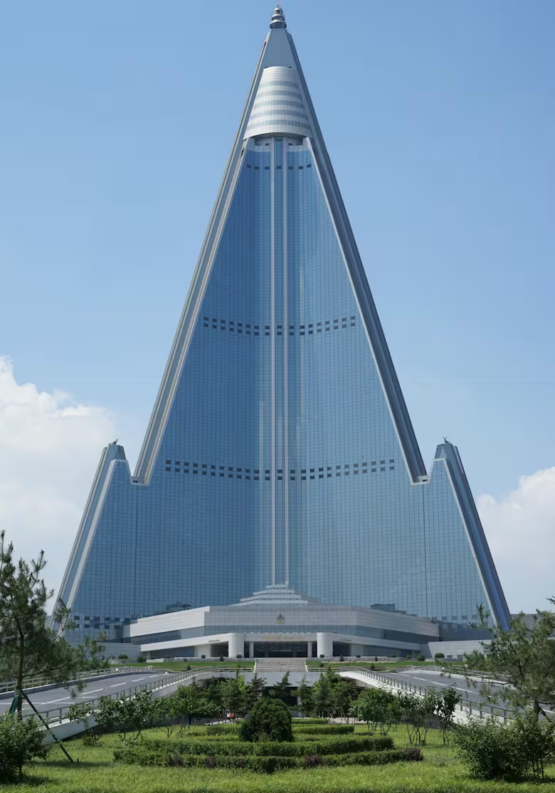 Uno de los edificios más emblemáticos de Pyongyang, la capital de Corea del Norte, es el Hotel Ryugyong, el cual empezó a ser construido en el año 1987 y nunca ha podido ser inaugurado o habilitado al público oficialmente.