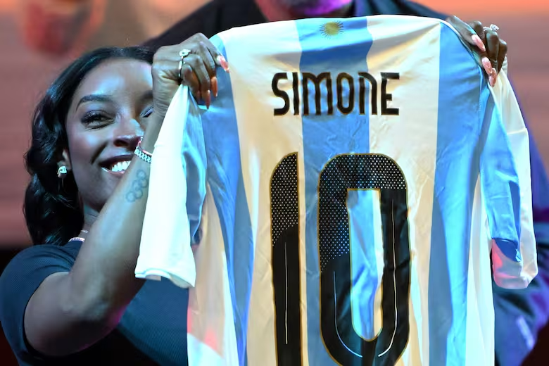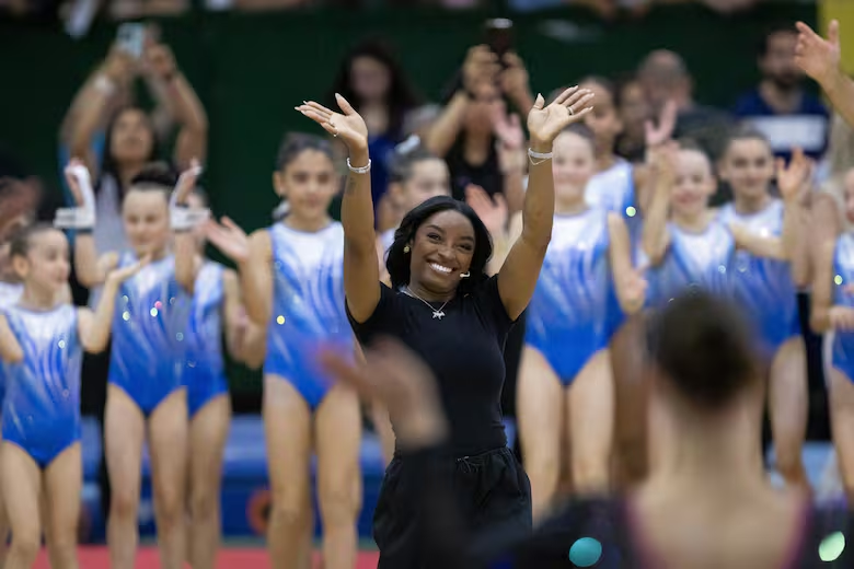 Simone Biles durante la clinica que brindo en Estadio Mary Terán de Weiss, del Parque Roca. durante su paso por la ciudad, en el marco de su distinción como 'Huésped de Honor' y la designación de Buenos Aires como Capital Mundial del Deporte 2027.