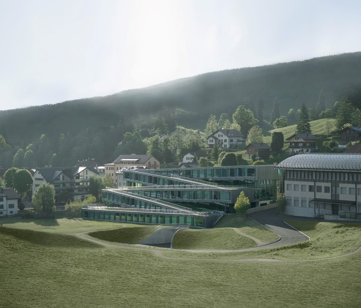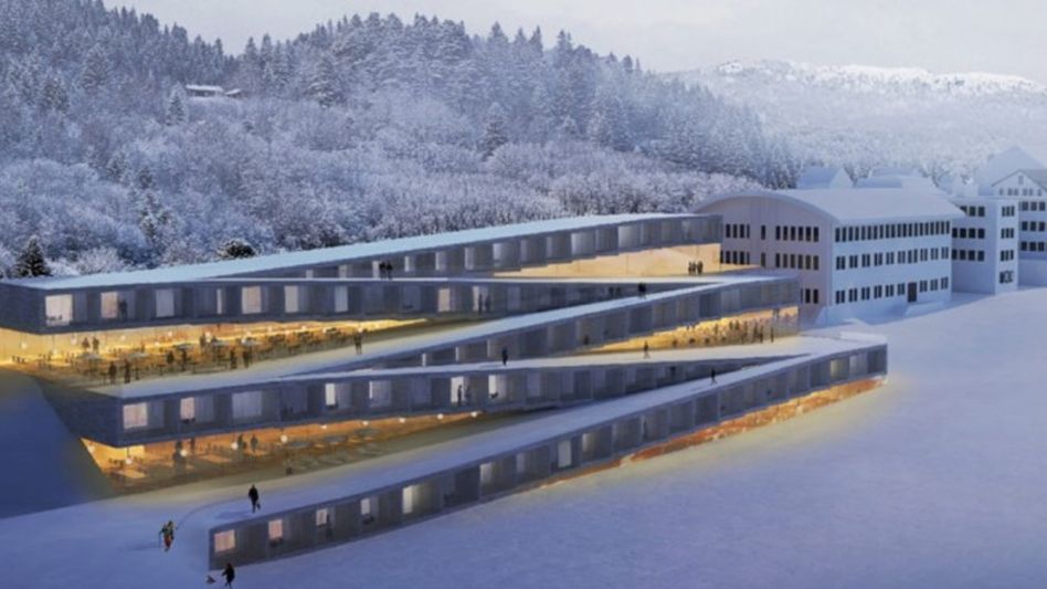 En lugar de un edificio tipo bloque, el nuevo hotel surge del paisaje circundante y se despliega suavemente sobre el terreno.