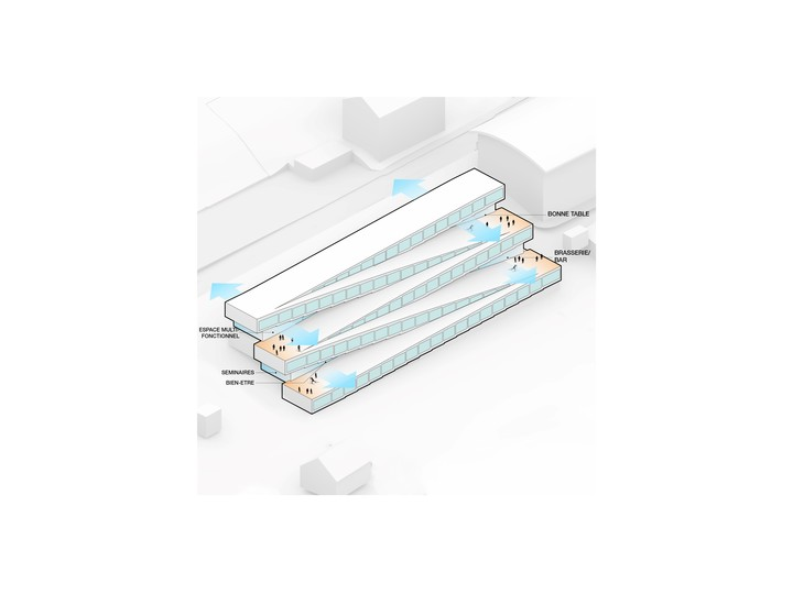 Un nivel por debajo de la entrada, un spa, un centro de conferencias y dos restaurantes están orientados hacia el valle, ofreciendo vistas panorámicas y luz natural, a la vez que actúan como destinos individuales a lo largo del camino interior.