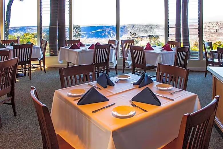 El bar Uncle George's Lounge propone una carta informal y tragos típicos, con vista directa a la caldera del Kilauea
