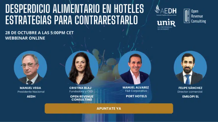 Manuel Vegas (Presidente Nacional de la AEDH), Cristina Blaj (Fundadora de Open Revenue Consulting) y Felipe Sánchez (Director Comercial en EMILOPI S.L.), quienes analizarán los principales desafíos, estrategias y buenas prácticas para reducir el desperdicio y avanzar hacia un turismo más eficiente, responsable y sostenible.
