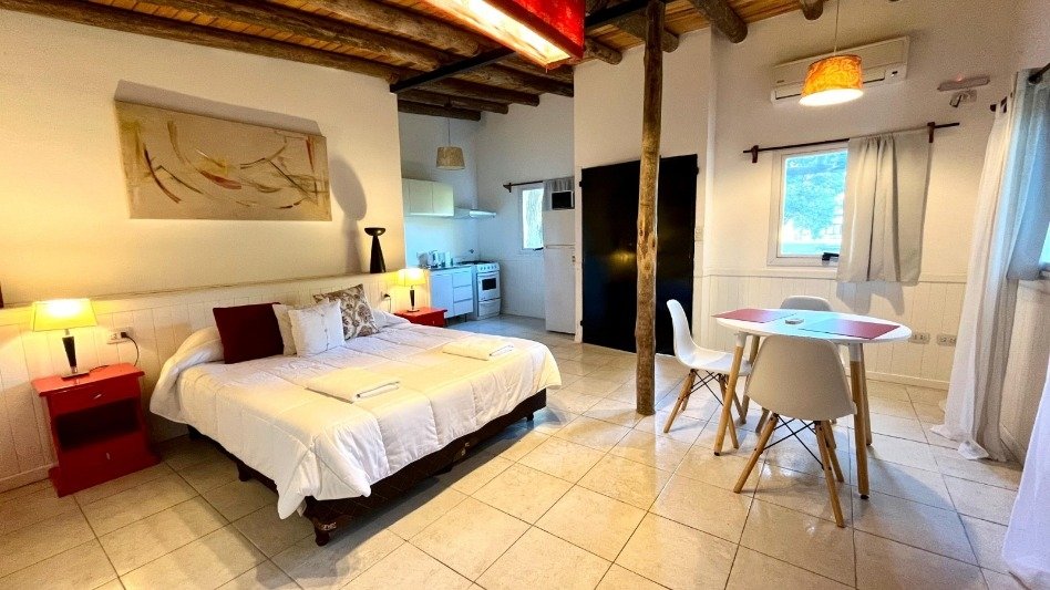 Un lugar único e íntimo. El Loft Frison para 2 personas, incluye cafetera nespresso, pava eléctrica y heladera minibar, sin cocina, blancos incluidos. En sus afueras puede disfrutar del fogón y el mismo utiliza la piscina central del complejo