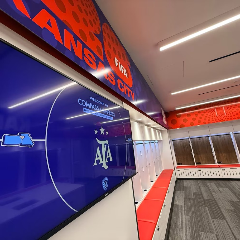Un vestuario moderno en el Centro de Rendimiento Nacional Compass Minerals en Kansas City, con pantallas y mobiliario contemporáneo, mostrando la marca FIFA y el logo AFA. Allí entrenará la Selección durante el Mundial (@Argentina)