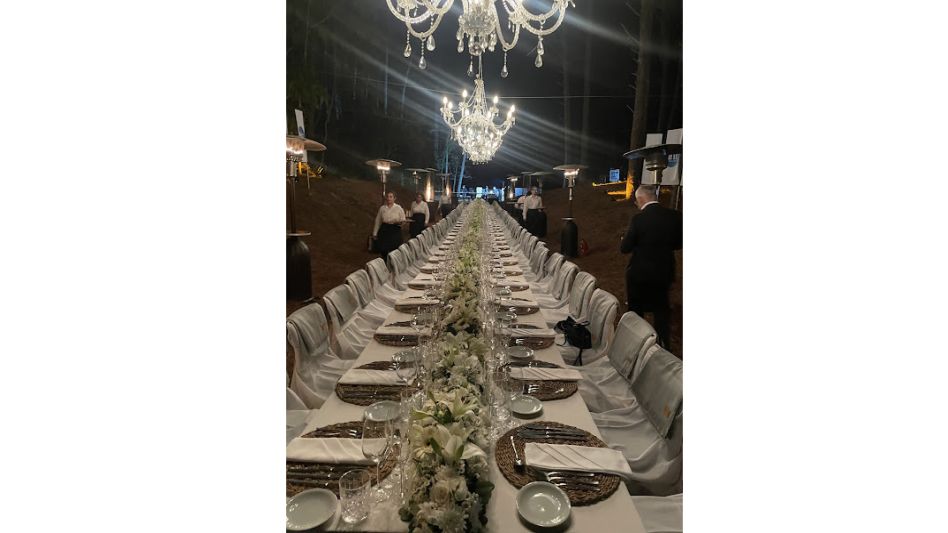 Puntualmente 21 hs nos invitaron a sentarnos en los lugares consignados para cada uno, con una mesa impecablemente preparada con arreglos florales blancos de excelencia y una longitud aproximada de 60 mts.