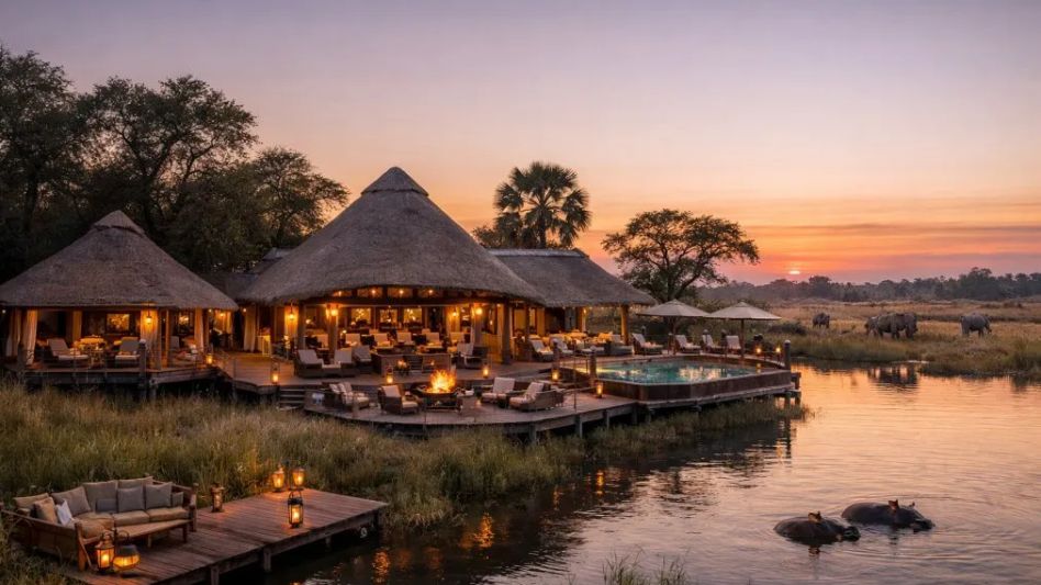 Lodges de safari en el delta del Okavango: alojamientos integrados a la selva africana donde la arquitectura, el paisaje y la vida salvaje forman parte de la experiencia.